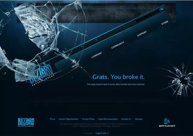 暴雪告訴我們404也可以做成這樣,他們并沒有讓用戶感覺自己立刻脫離整體網站的大環境,而是打造了一個被破壞的場景,一句簡單的“Grats.You broke it”反而告訴用戶是你搞砸了網站,看到這,是不是還有點沾沾自喜呢…