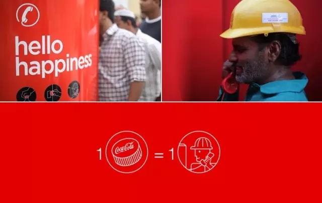 所謂幸福,對他們而言,就是能聽到孩子的叫聲,能聽到家人的聲音。了解到這批人的實際情況后,迪拜可口可樂聯合揚羅必凱廣告公司開發了一款可以用可樂瓶蓋當通話費的“hello happiness“電話亭裝置,把這些電話亭放到工人們生活的地區,每一個可口可樂瓶蓋都可以免費使用三分鐘的國際通話費。