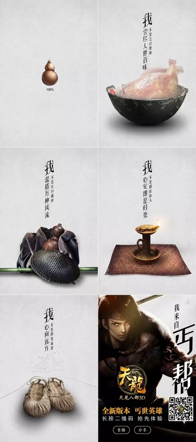 《天龍八部3D》丐世英雄版本專題的h5推廣頁,玩天龍的玩家都知道游戲中的各個幫派,其中丐幫是受很多玩家青睞的一個門派。此次新版本因為要推出全新的“丐幫”職業,所以頁面在前期的創意中也是立足于對丐幫中人的描述,力求能夠打動鐘愛丐幫和武俠游戲的玩家,頁面上線后也是引起了一致的好評。